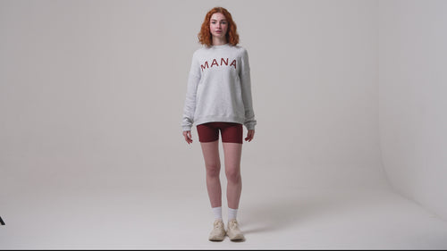 Women's lifestyle crew neck with varsity style MANA applique logo to front chest and embroidered logo branding on back neck.